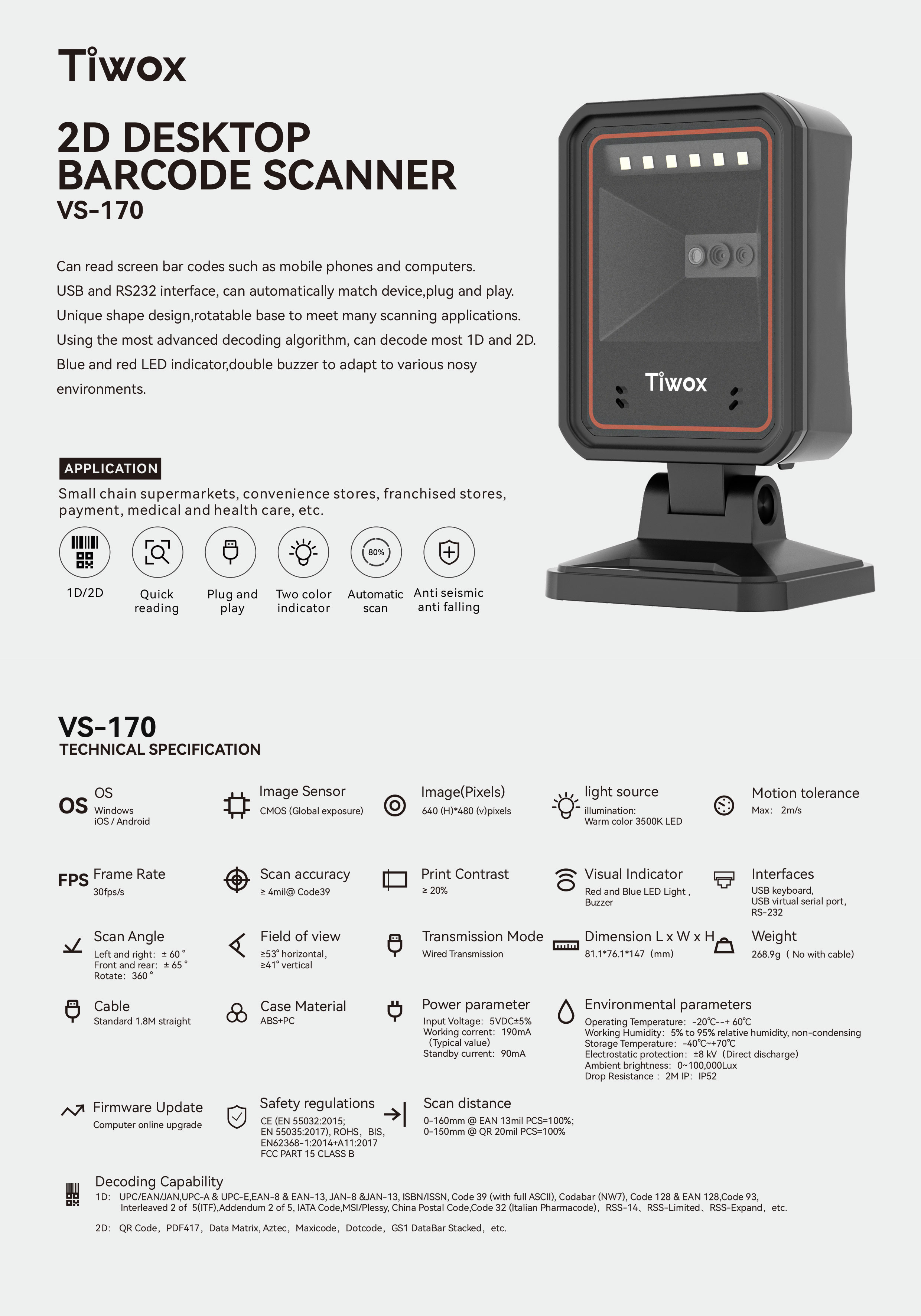 Tiwox VS-170 1D/2D Masaüstü Barkod Okuyucu